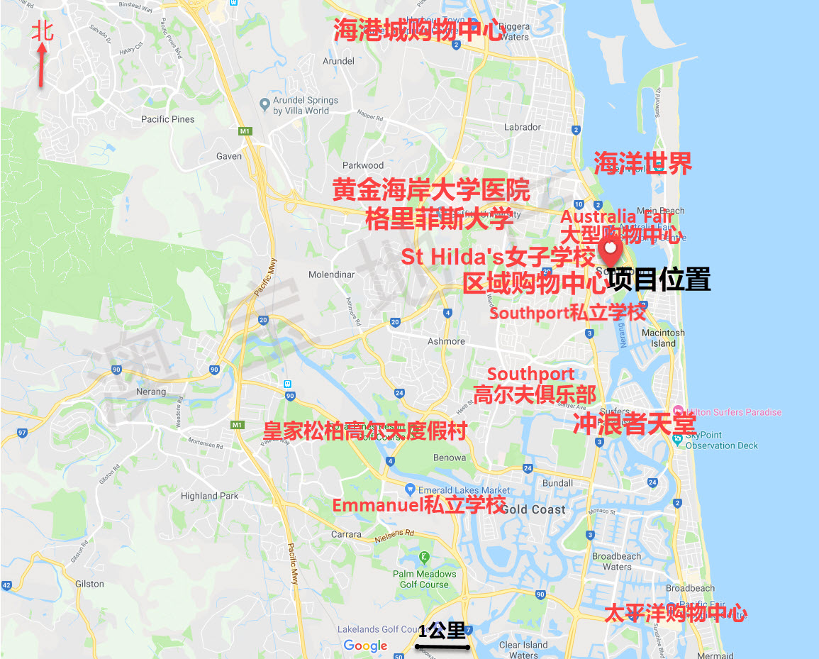 位于 Southport 的核心地段,步行片刻即可到达大型购物中心 Australia Fair Shopping Centre 和当地的“唐人街 (Chinatown)”区域,日常购物、餐饮、休闲都十分方便。同样,步行可到轻轨站,轻轨直达黄金海岸各主要地区。项目的对面就是Southport Broadwater Parklands,这里是知名的公共绿地与海滨休闲区,设有游乐场、野餐区、步道和儿童活动设施,是当地居民与游客常去的热门地点。