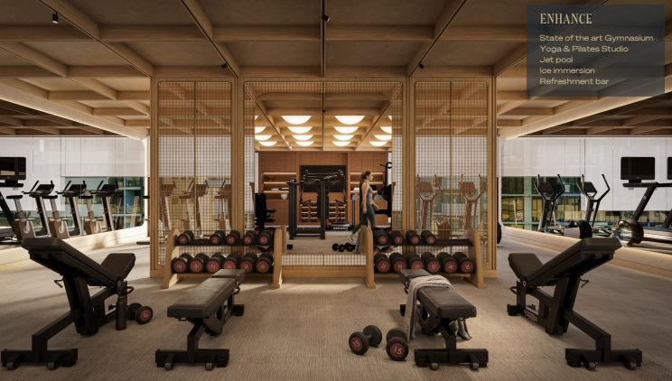 而 The Club 业主会所更侧重身心平衡与社交互动。这里设有私人用餐区与品酒空间、图书馆、影音室,以及共享办公区、独立办公舱与会议室,满足休闲、办公与社交等多重需求。健身与康养配套尤为完善,包括现代化健身房、瑜伽与普拉提空间、水疗池、冷热浸泡池、冰疗池、红光理疗床、蒸汽房、红外桑拿、按摩理疗室等设施,让运动、放松与修复形成完整闭环。