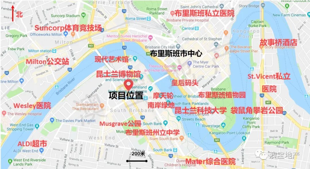 项目地处布里斯班艺术文化中心——南岸。这里曾经是1988年世博会的举办地,具有深厚的人文气息与艺术底蕴。世博旧址、地标The Wheel of Brisbane、GOMA艺术馆、昆士兰博物馆、QPAC艺术中心、布里斯班会展中心全都在项目10分钟步行距离之内。