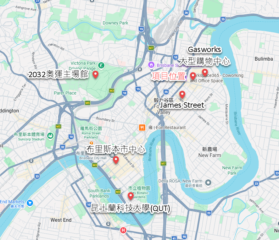項目位於Brisbane最受矚目的內城高端區——Newstead,屬於典型的「河岸生活+城市核心」雙重價值地段。區內匯聚Brisbane最具代表性的生活地標,包括Gasworks Plaza及James Street,高端餐飲、精品購物、咖啡文化與夜生活集中於此。同時鄰近Brisbane River河岸步道與綠化空間,將城市繁華與自然景觀完美結合,打造極具質感的生活方式。