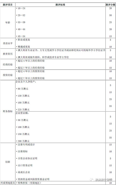该签证面向企业的法人、股东、高级管理人员。该签证对学历和英语无具体要求,只要投资人年龄在55周岁以下,家庭资产在80万澳元以上,公司营业额超过50万澳元(最多两家公司相加)并持股一定比例,满足相应的移民评分,便可递交移民申请。