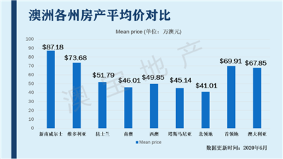 但是,进入2020年,由于疫情的原因,上半年整个澳洲的房产都属于比较疲软的状态。下面的柱形图是根据每个州的中位价进行的比较,跟之前表格每个州首府房价有所不同,首府城市的中价位会比该州要高一些。这个核算价格是根据当期所销售的房子的情况进行一个计算的,所以说不能完全代表整体市场状况。