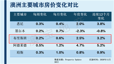 今年6月,政府出台了一系列的补助政策,以及央行降息的刺激。下半年进入了房产的火热状态。根据2020年的11月30号刚出炉的澳洲房产价格分析报告。我们可以看到,各个城市在去年一年基本都有一定小幅增长,其中布里斯班的表现是比较突出的,一年的增幅达到了3.2%。