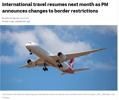 总理斯科特·莫里森在今天早晨的新闻发布会上宣布,预计在11月,澳洲疫苗接种率达到80%,国际旅行禁令将会正式取消。