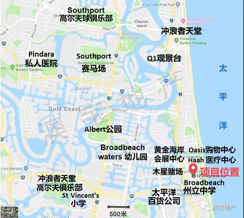 Broadbeach区是黄金海岸的重要商业中心,坐拥昆士兰最高端的购物中心太平洋购物商场(Pacific Fair),黄金海岸会展中心以及The Star木星综合娱乐度假村。该项目距布罗德海滩仅150米,区间内途径黄金海岸城市轻轨,公共交通便捷,生活舒适便利。