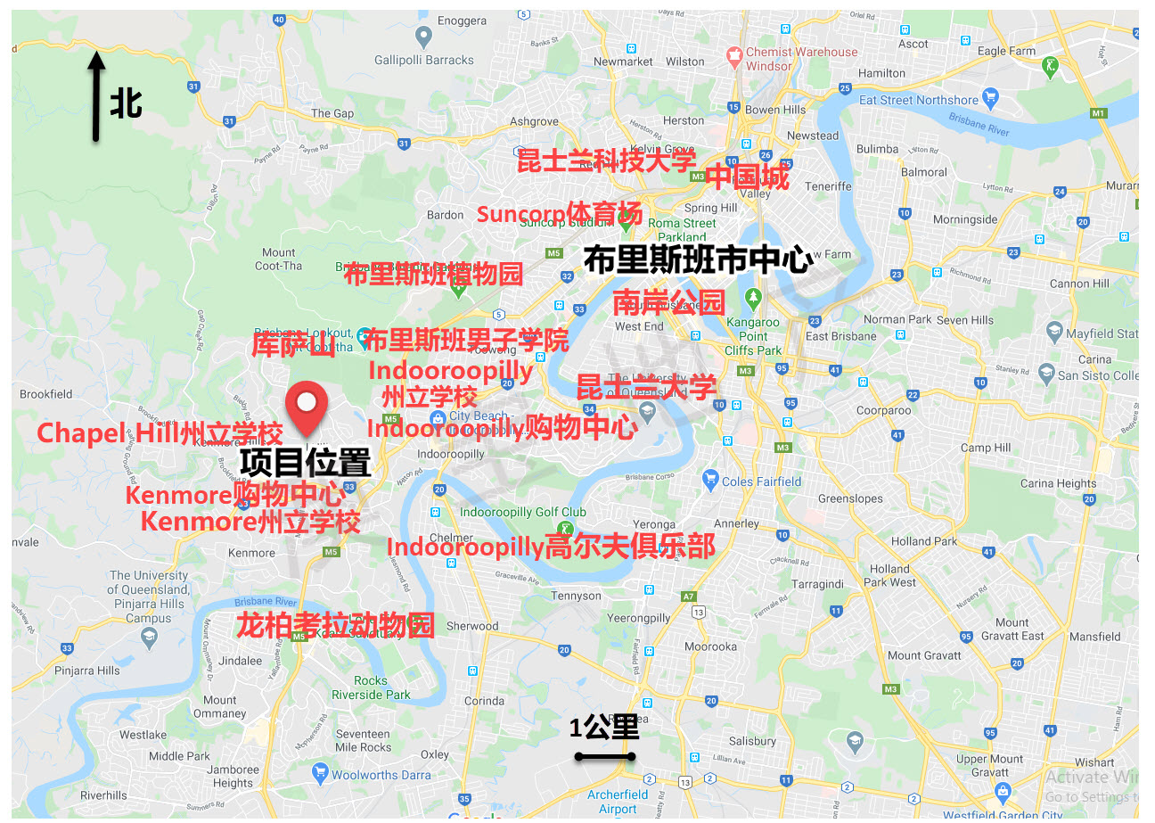项目位于著名的库撒山山脚下,距离布里斯班CBD以西7公里的Chapel Hill区,距布里斯班市中心约20分钟车程。项目周围高速公路、机场、各大商业中心一应俱全,距离区域购物中心仅1分钟车程,距西区最大的购物中心Indooroopilly Shopping Center约7分钟车程。作为著名学区地段,该项目距Chapel Hill州立学校仅350米,步行可达。距昆士兰大学约15分钟车程,并有公交车直达。