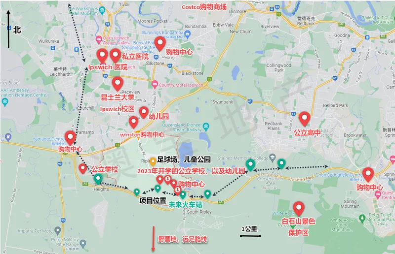 Ripley将新建医院、社区、学校、公园、公共交通设施等等。一旦该地区完全开发,预计将拥有 120,000 人口,估计有 50,000 套住宅。城市发展预计将提供200,000个就业岗位。Ripley 及周边地区靠近西部建设走廊,例如 South Ripley、Swanbank、Deebing Heights 和 White Rock,拥有适合新住宅、商业和工业开发的土地,都会得到飞速发展。