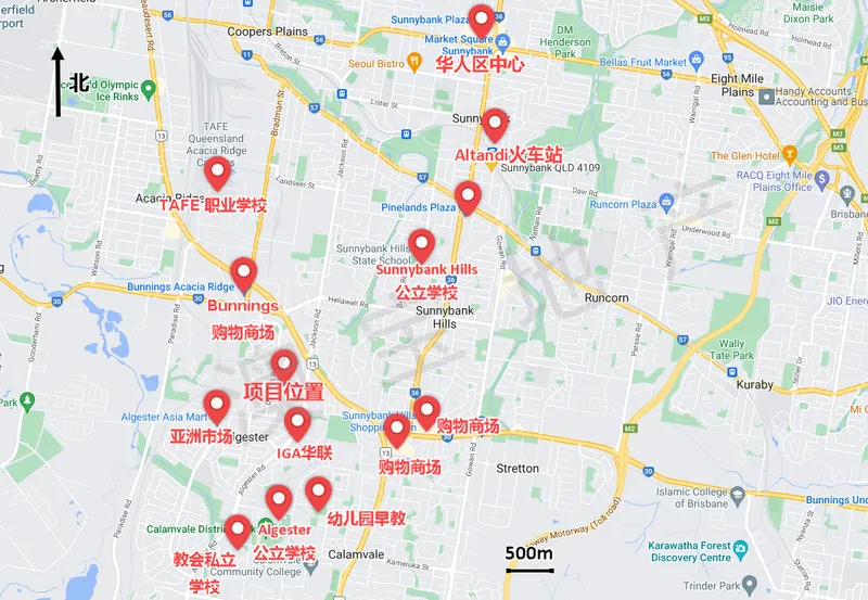 5分钟车程内可到达商业区以及多所学校,昆士兰州主要商务园区布里斯班工业园离此仅 10 分钟车程,昆州主要就业中心之一,其容纳超过 150 家国内国际企业,以及不同领域的几千名员工。教育方面包括Algester State School、St Stephen天主教学校、 Goodstart 早教中心等优质教育资源,且距离昆士兰著名综合大学-格里菲斯大学仅13分钟车程。