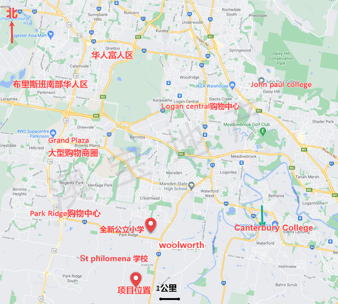 在交通格局上,该区域拥有极具优势的路网结构。包括 M1 Pacific Motorway、Logan Motorway 以及 Mount Lindesay Highway 等多条主干道贯穿周边区域,形成连接布里斯班CBD与黄金海岸的重要交通走廊。同时,布里斯班至黄金海岸铁路走廊也进一步增强了区域的整体可达性与通勤便利性。